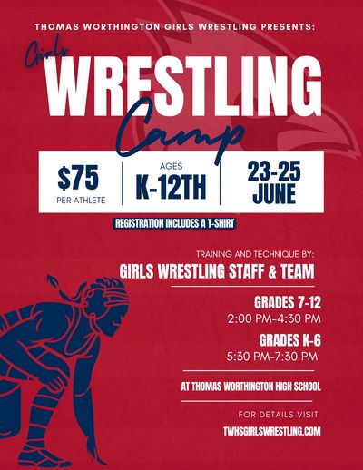 Join us this summer for the Thomas Worthington Girls Wrestling Camp, open to girls of all experience levels. Whether you’re brand new to wrestling or have been competing for years, this camp is designed to help athletes build skills, confidence, and a love for the sport in a fun and encouraging environment. We have camps for bothYouth Girls (K–6th Grade) and Middle School & High School Girls (7th–12th Grade).